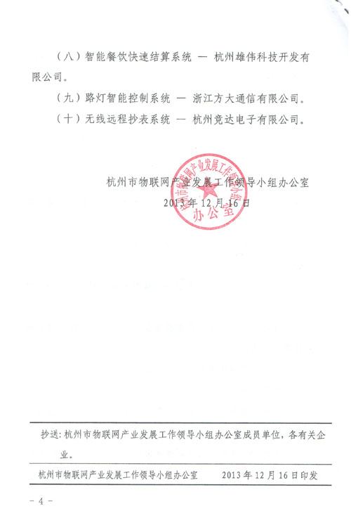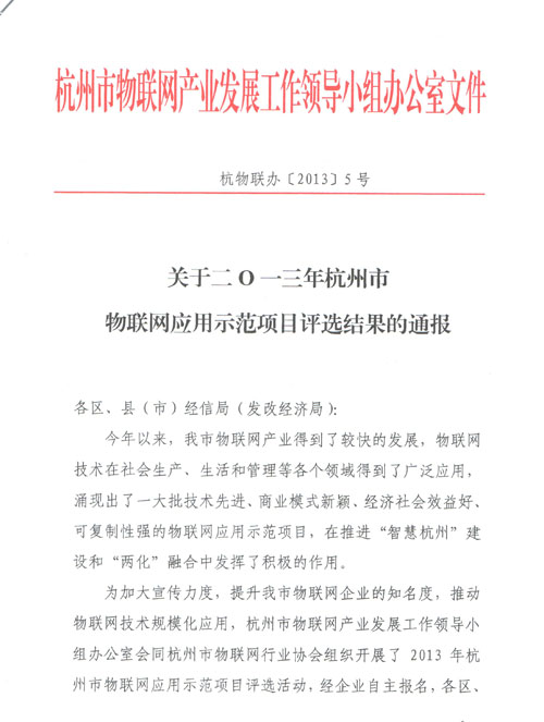Recently, the Hangzhou Internet of Things Industry Development Leading Group Office announced the outstanding projects of Hangzhou Internet of Things Application Demonstration Projects in 2013, and the "Wireless Remote Meter Reading System" developed, produced and put into use by our company was selected. Our company's "Jingda Technology Park" uses this system, and customers can see the real-time usage and curve charts of all remote meters in the park in real time.