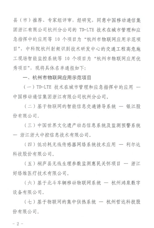 近日,杭州市物联网产业发展工作领导小组办公室公布了2013年杭州市物联网应用示范项目优秀项目,本公司研发并生产且已投入使用的“无线远程抄表系统”入选。本公司“竞达科技园”应用的就是该系统,客户可实时看到园区内所有远传表具的实时用量和曲线图。